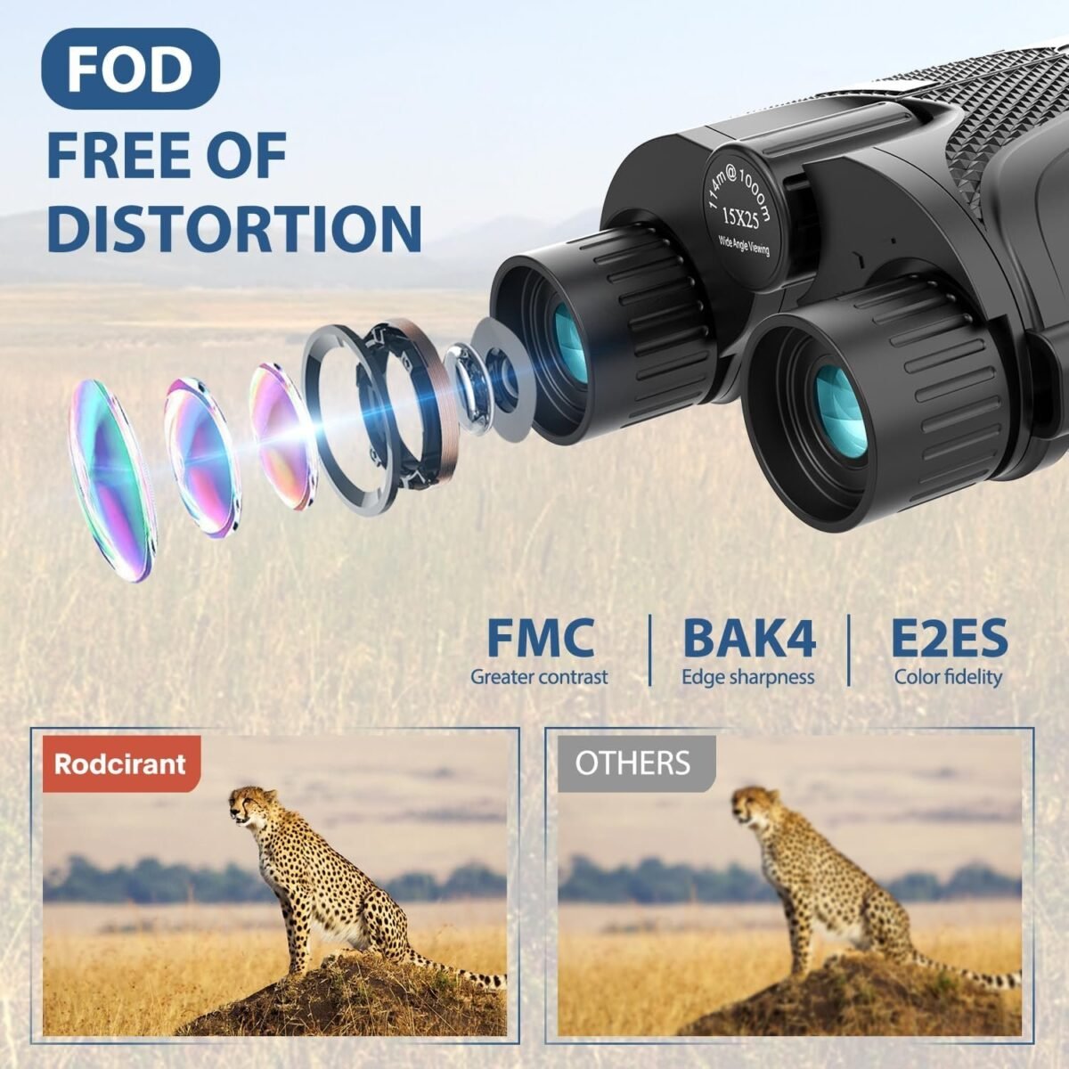 Binoculars 15×25 ,this binoculars has 15x magnification, 25mm objective lens and wide field of view, 399t/1200yds and provides high definition without a color-changed or blurred image.so you’ll be able to observe a great deal without actually adjusting their position.